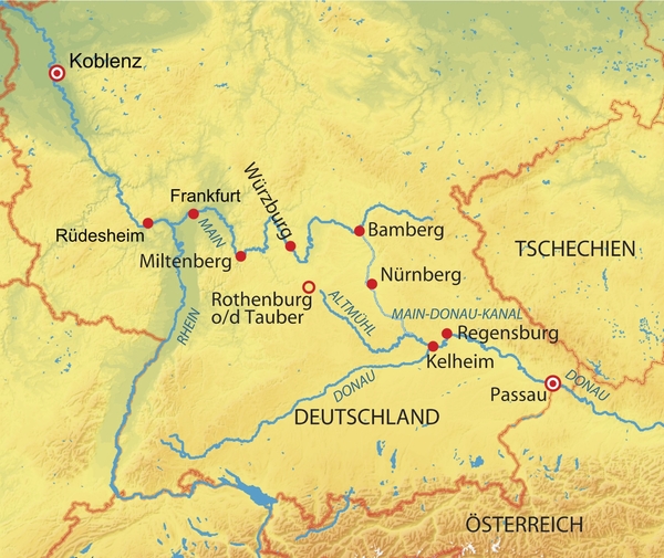 Sie starten Ihre Urlaubsreise in Passau. Ihr erstes Ziel ist die wunderschöne Stadt Regensburg. Ab Kelheim besuchen Sie den eindrucksvollen Donaudurchbruch, von überraschender Schönheit ist dann die Fahrt durch das Altmühltal. Von Nürnberg aus durchfahren Sie das fränkische Weinland und nehmen Kurs auf die Residenzstadt Würzburg. Am Rande des Spessart entlang führt der Main Sie auf eine erlebnisreise Fahrt durch malerische Landschaften sowie zu den schönsten Städten Frankens. Ihr Schiff steuert in den Rheingau mit von Weindörfern gesäumten Ufern, vorbei am Loreley-Felsen. Entlang des Mittelrheins genießen Sie ein Panorama mit unzähligen Burgen, bevor Ihre Reise in Koblenz am berühmten Deutschen-Eck endet.