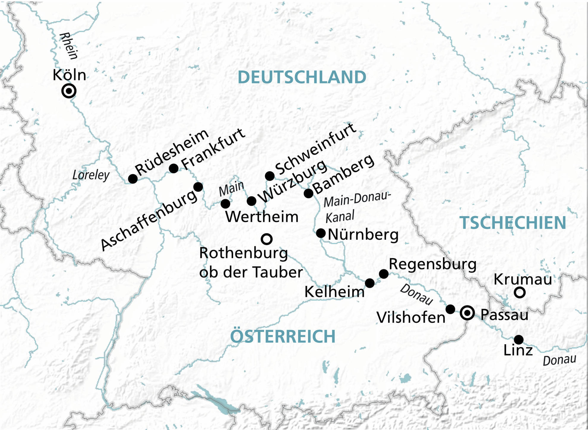 Passau - Linz - Vilshofen - Regensburg - Kehlheim - Main-Donau-Kanal - Nürnberg - Bamberg - Würzburg - Wertheim - Aschaffenburg - Frankfurt - Rüdesheim - Köln