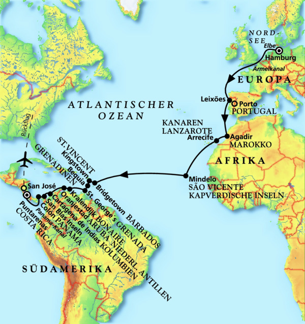 Hamburg - Agadir - Arrecife - Mindelo - Bridgetown - St. George's - Kralendijk - Cartagena de Indias - Colón - Puntarenas