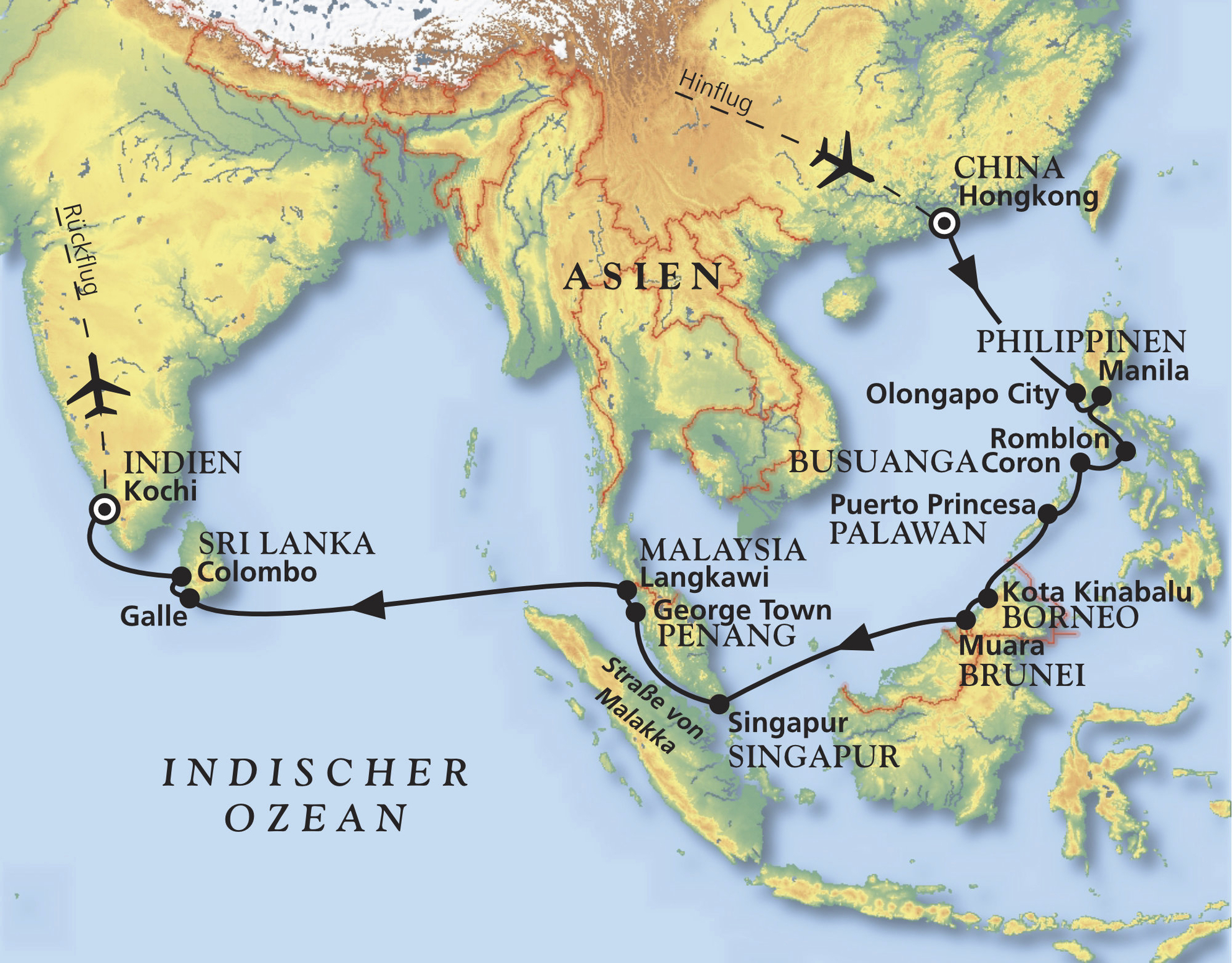 Hongkong - Olongapo City (Philippinen) - Manila - Romblon (Philippinen) - Coron (Philippinen) - Palawan (Philippinen) - Borneo - Singapur - Langkawi (Malaysia) - Colombo - Kochi