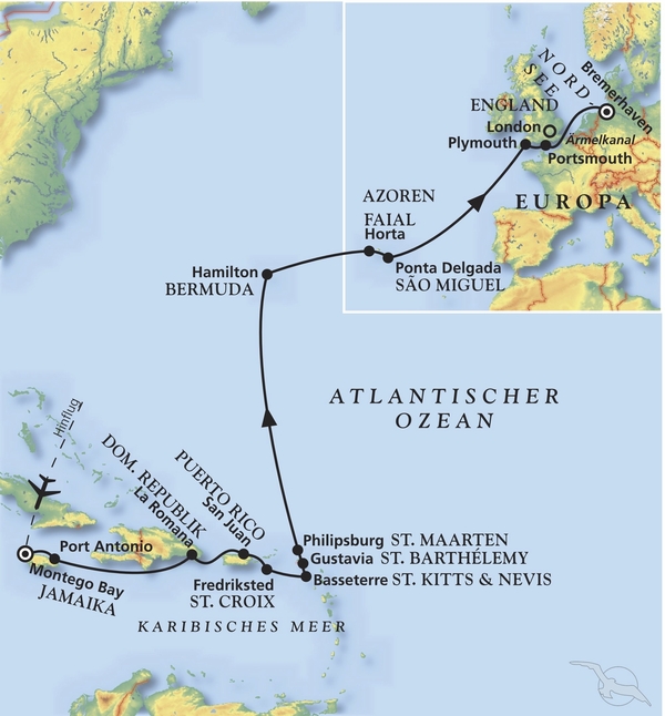 Montego Bay - Puerto Rico - Basseterre - St. Maarten - Hamilton - Horta - Ponta Delgada - Plymouth - Portsmouth - Bremerhaven