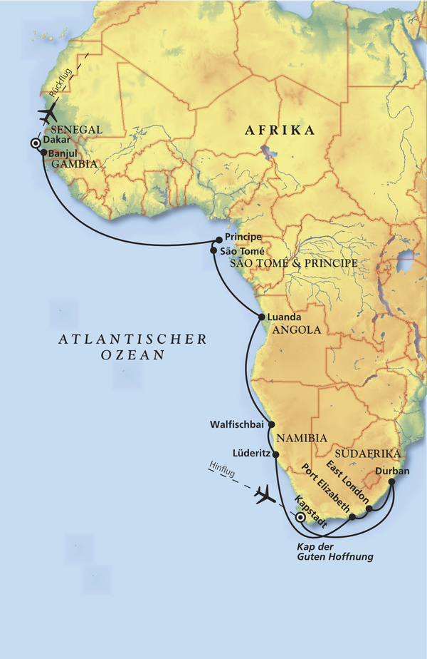 Kapstadt - Durban - Port Elizabeth - Lüderitz - Walfischbai - Luanda - São Tomé - Principe - Banjul - Dakar