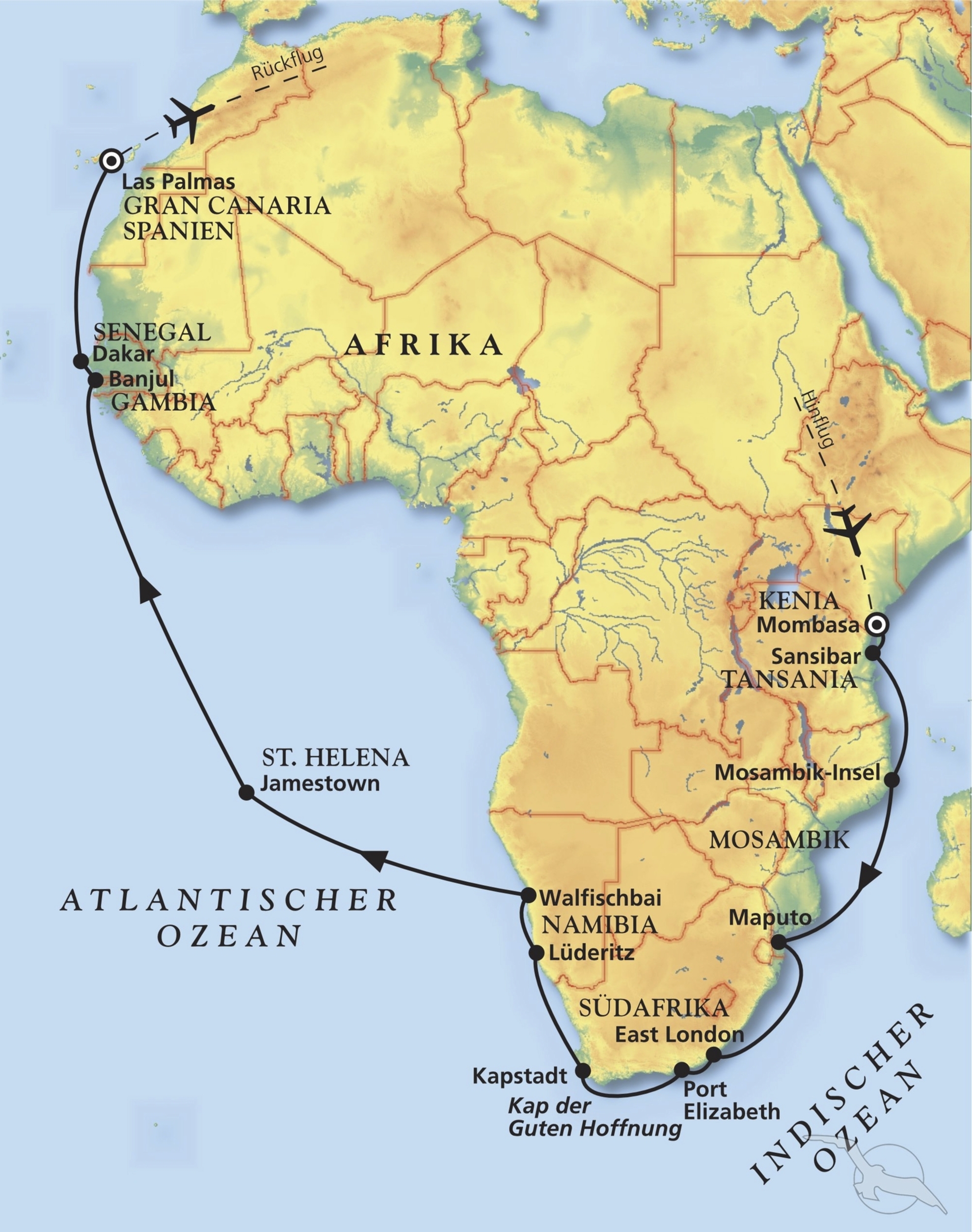 Mombasa - Sansibar - Mosambik-Insel - Maputo - Port Elizabeth - Kapstadt - Lüderitz - Walfischbai - St. Helena - Banjul - Dakar - Las Palmas (Gran Canaria)