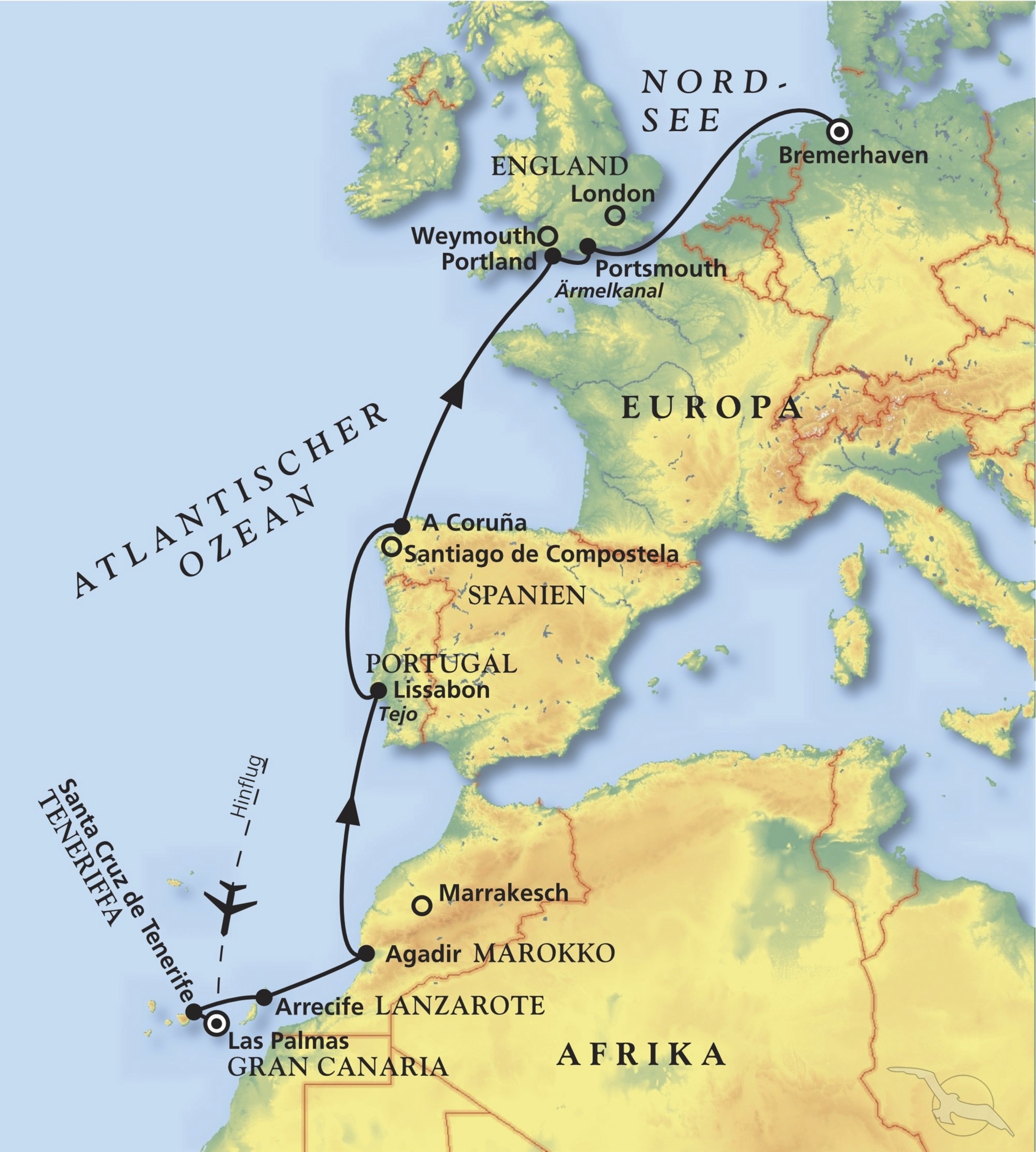 Las Palmas (Gran Canaria) - Santa Cruz de Tenerife - Arrecife (Lanzarote) - Agadir - Lissabon - A Coruña - Portland - Portsmouth - Bremerhaven