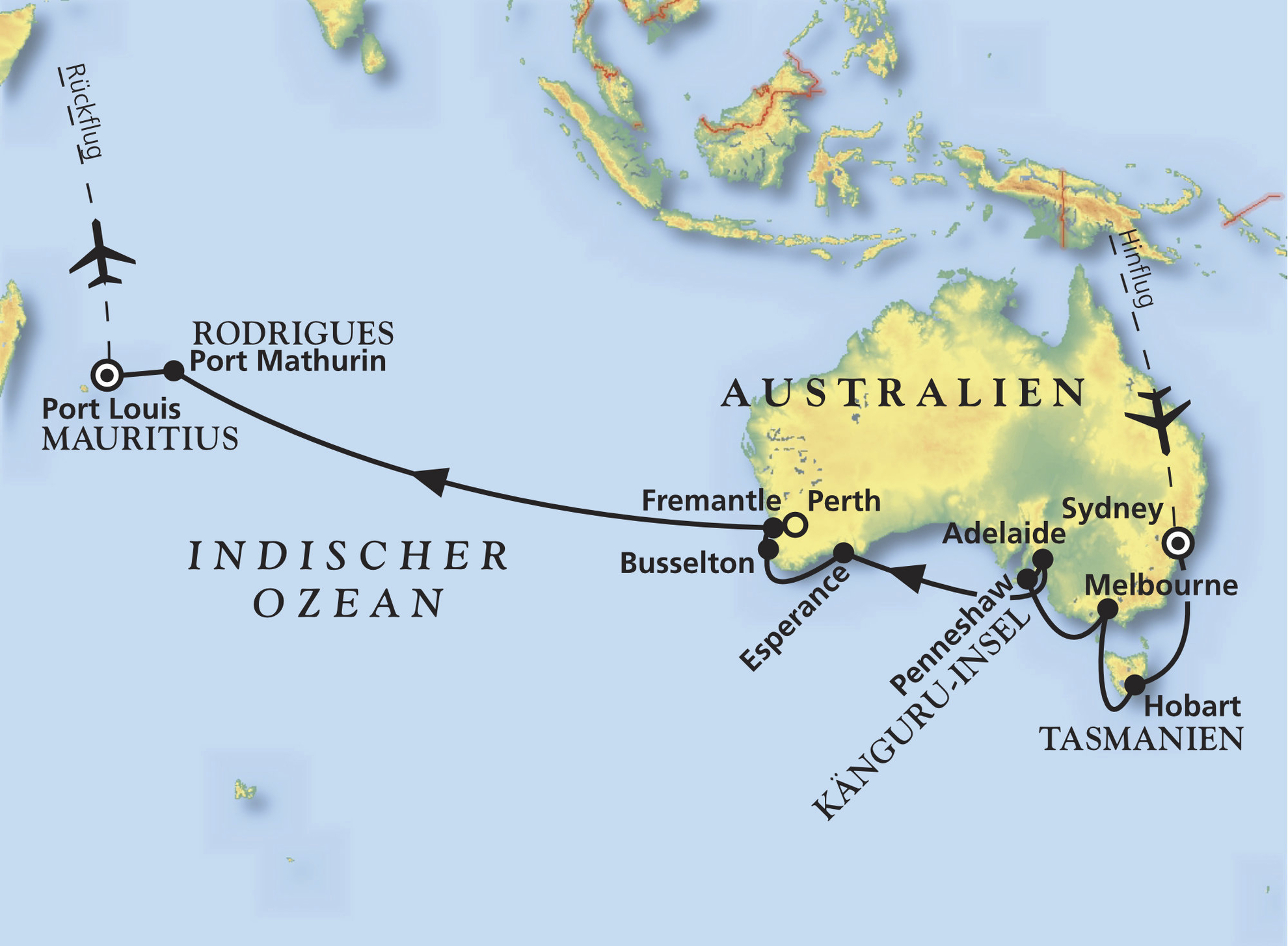 Sie fahren etwa 30 Min. mit dem Bus zum Flughafen von Cambridge. Während des knapp einstündigen Fluges sehen Sie die spektakuläre Ostküste von Tasmanien und genießen Ausblicke auf Weinberge, Strände und die atemberaubende Freycinet-Halbinsel mit ihren rosarot-farbigen Granitbergen, einsamen Buchten und der malerischen Wineglass Bay. Sie erreichen Maria Island. Während Ihres ca. 1,5-stündigen Aufenthalts erfahren Sie Wissenswertes über die Entdecker und aus der Zeit, als hier Anfang des 19.Jh. von den Engländern eine Strafkolonie eingerichtet wurde. Lernen Sie das einmalige Naturschutzgebiet kennen, mit Eukalyptuswäldern, wunderschönen Stränden und einigen Überresten ehemaliger Farmhäuser. Maria Island ist weiterhin bekannt für seine Wildtiere und beherbergt seltene und gefährdete Arten wie den Mauersegler und die Kap-Barrón-Gans, Wombats, Kängurus und natürlich den Tasmanischen Teufel. Es gibt keine Garantie, dass sich die Tiere in der Natur zeigen, aber halten Sie Ausschau während eines Spazierganges. Weiterhin genießen Sie ein Meeresfrüchte-Mittagessen, begleitet von lokalem Wein, bevor Sie Ihren Rückflug nach Cambridge/Hobart antreten. Mit dem Bus geht es dann wieder zurück zum Schiff.
