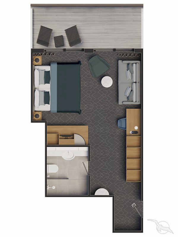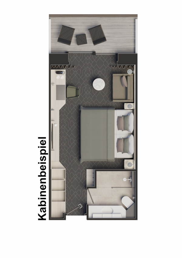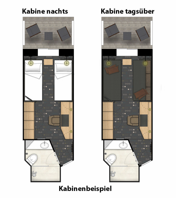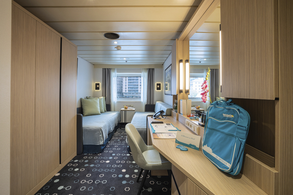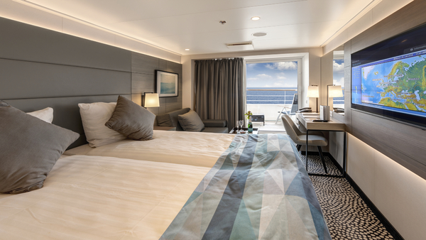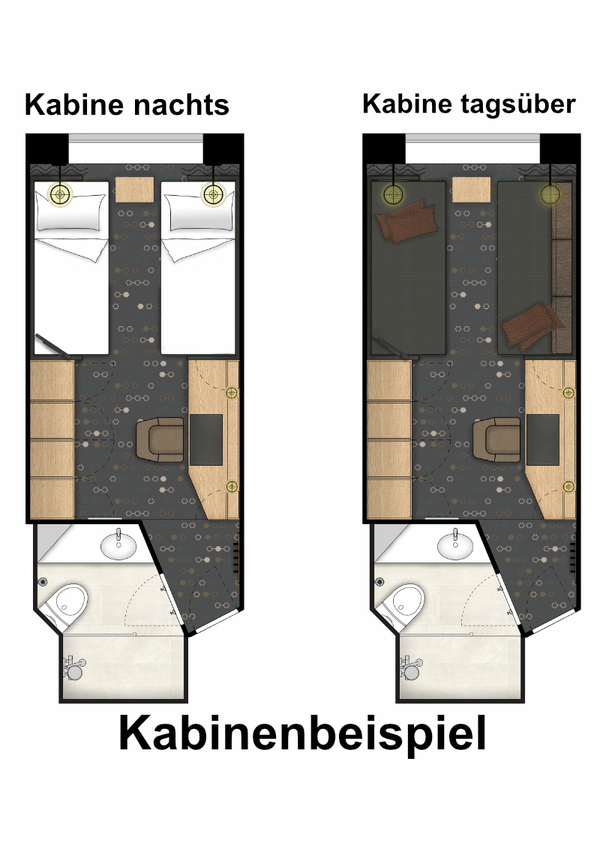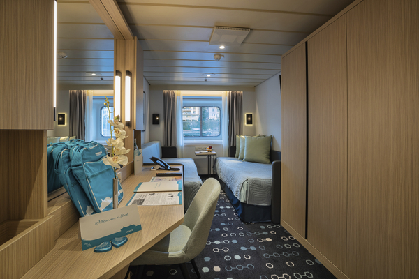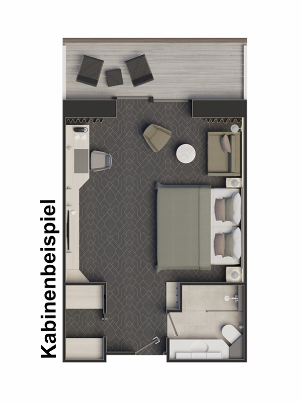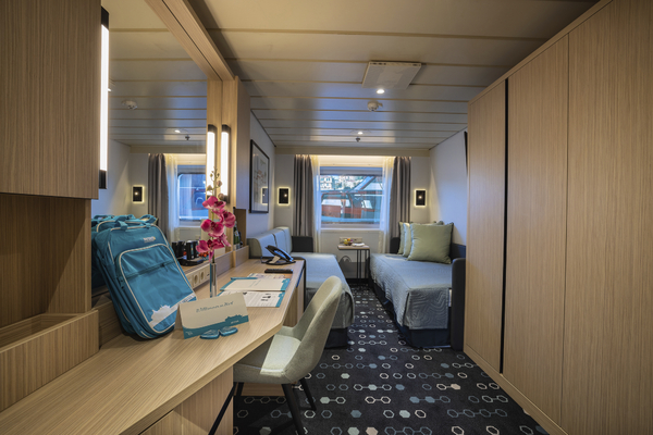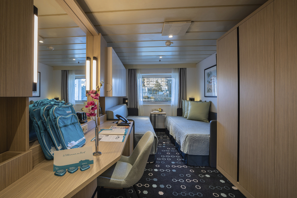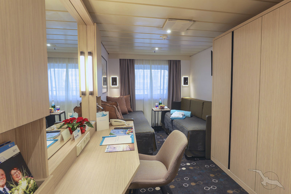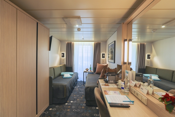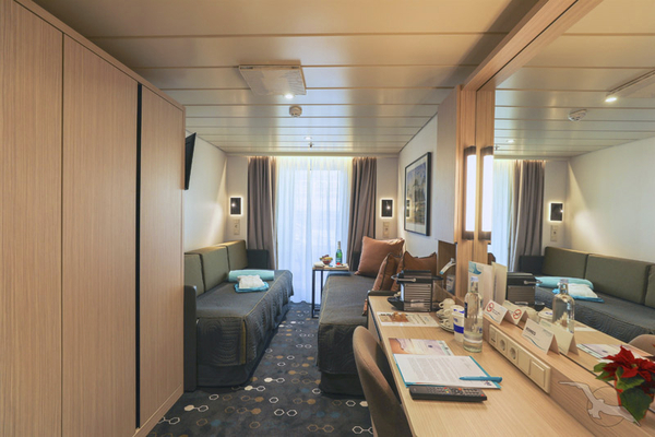 Einige Kabinen verfügen über ein Zusatzbett (1 ZB) bzw. zwei Zusatzbetten (2 ZB): zusätzlich einklappbares Oberbett (Kat. H, O) bzw. in den Kabinen der Kategorien S, T, U, V und W mit Schlafsofa, Kat. Q+ mit Schlafsessel. Erwachsener im Zusatzbett 1.500 €. Kinder (2-11 Jahre) 500 € und Jugendliche (12-19 Jahre) 700 € im Zusatzbett.