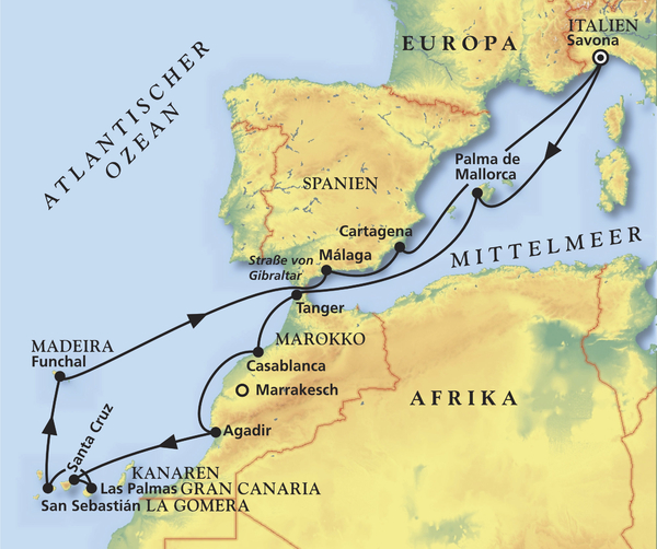 Savona - Palma de Mallorca - Tanger - Santa Cruz de Tenerife - Las Palmas (Gran Canaria) - San Sebastián (La Gomera) - Funchal (Madeira) - Málaga - Cartagena - Savona