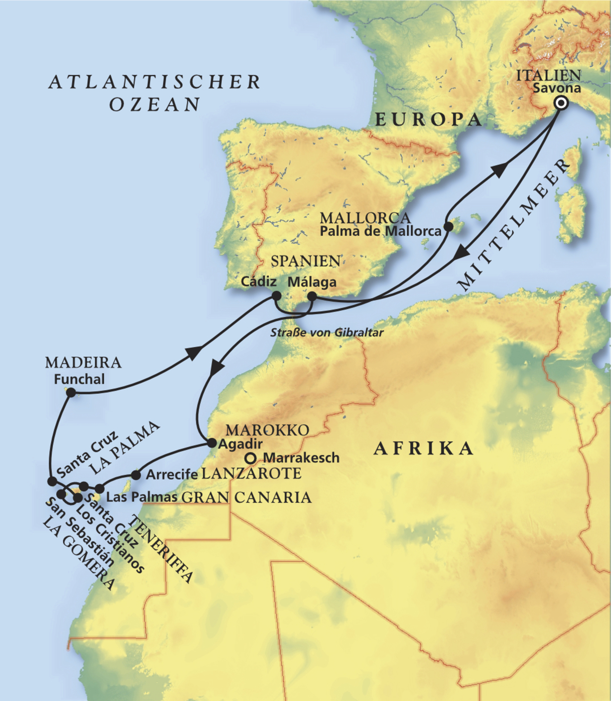 Savona - Málaga - Agadir - Arrecife - Las Palmas - San Sebastián - Funchal - Cadiz - Savona