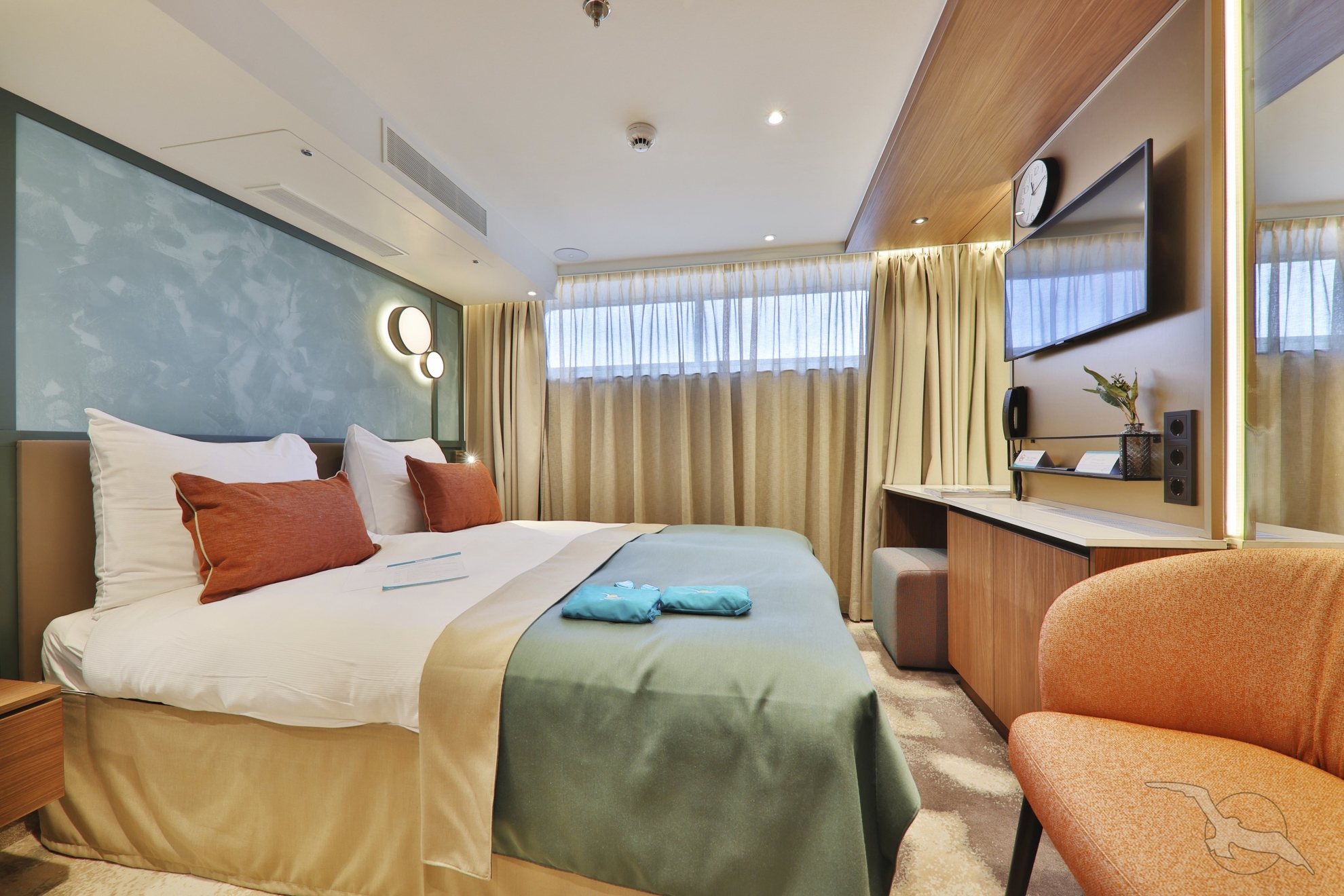 Alle Kabinen liegen außen, sind komfortabel sowie luxuriös eingerichtet und haben einen französischen Balkon. Die Betten lassen sich wahlweise als Doppel- oder Einzelbetten stellen.