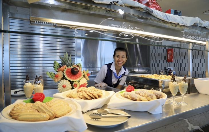 Ab einer Reisedauer von 7 Tagen erhalten Sie zusätzlich folgenden Service: 1x Sekt-Kabinen-Frühstück pro Person/ Reise, Kapitänsempfang, Einladung zum Kapitänstisch (Kat. W), 1x 25 Minuten Massage oder Beauty-Behandlung pro Person/Reise, kostenloser Wäscheservice. Falls bei Flügen Business-/First-Class möglich ist, erhalten Sie das Angebot bevorzugt.