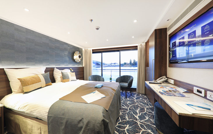 Alle Kabinen liegen außen, sind komfortabel und elegant eingerichtet mit französischem Balkon, raumhoher Fensterfront und Schiebetür. Die Betten lassen sich wahlweise als Doppel- oder Einzelbetten stellen. Ausstattung: Dusche/WC, Fön, individuell regulierbare Klimaanlage, SAT-TV (Flachbildschirm), Radio, Minibar, Safe, Telefon, Bordspannung 220 V Wechselstrom. Kabinengröße ca. 16 qm.