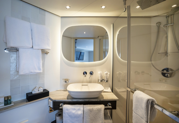Ausstattung: Dusche/WC, Fön, individuell regulierbare Klimaanlage, SAT-TV (Flachbildschirm), Radio, Minibar, Kaffeemaschine, Safe, Telefon. Die Bordspannung liegt bei 230 V Wechselstrom. Die Betten lassen sich wahlweise als Doppel- oder Einzelbetten stellen.  Kabinengröße ca. 17 qm.