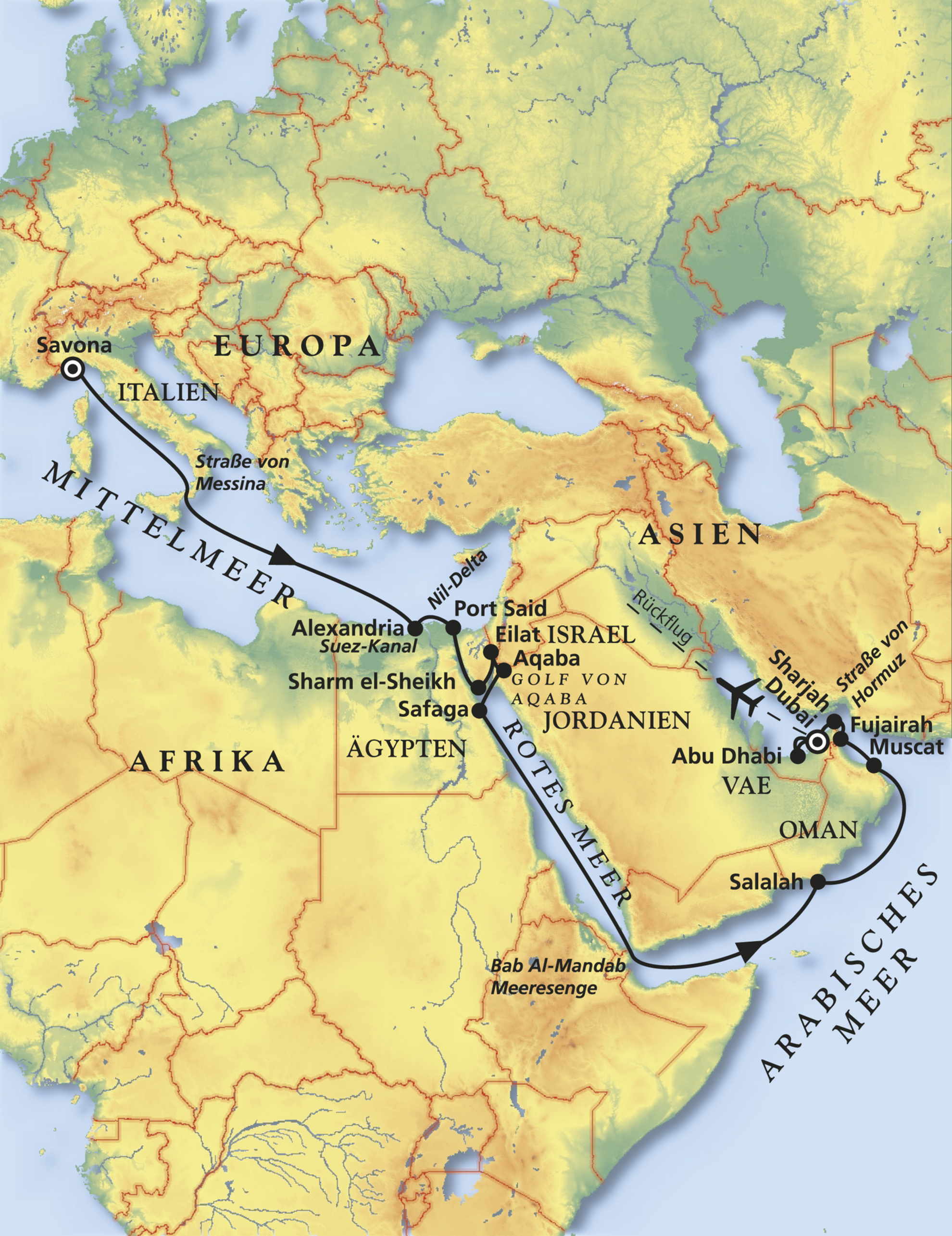 Savona - Suez-Kanal - Eilat - Aqaba - Safaga - Salalah - Muscat - Abu Dhabi - Dubai
