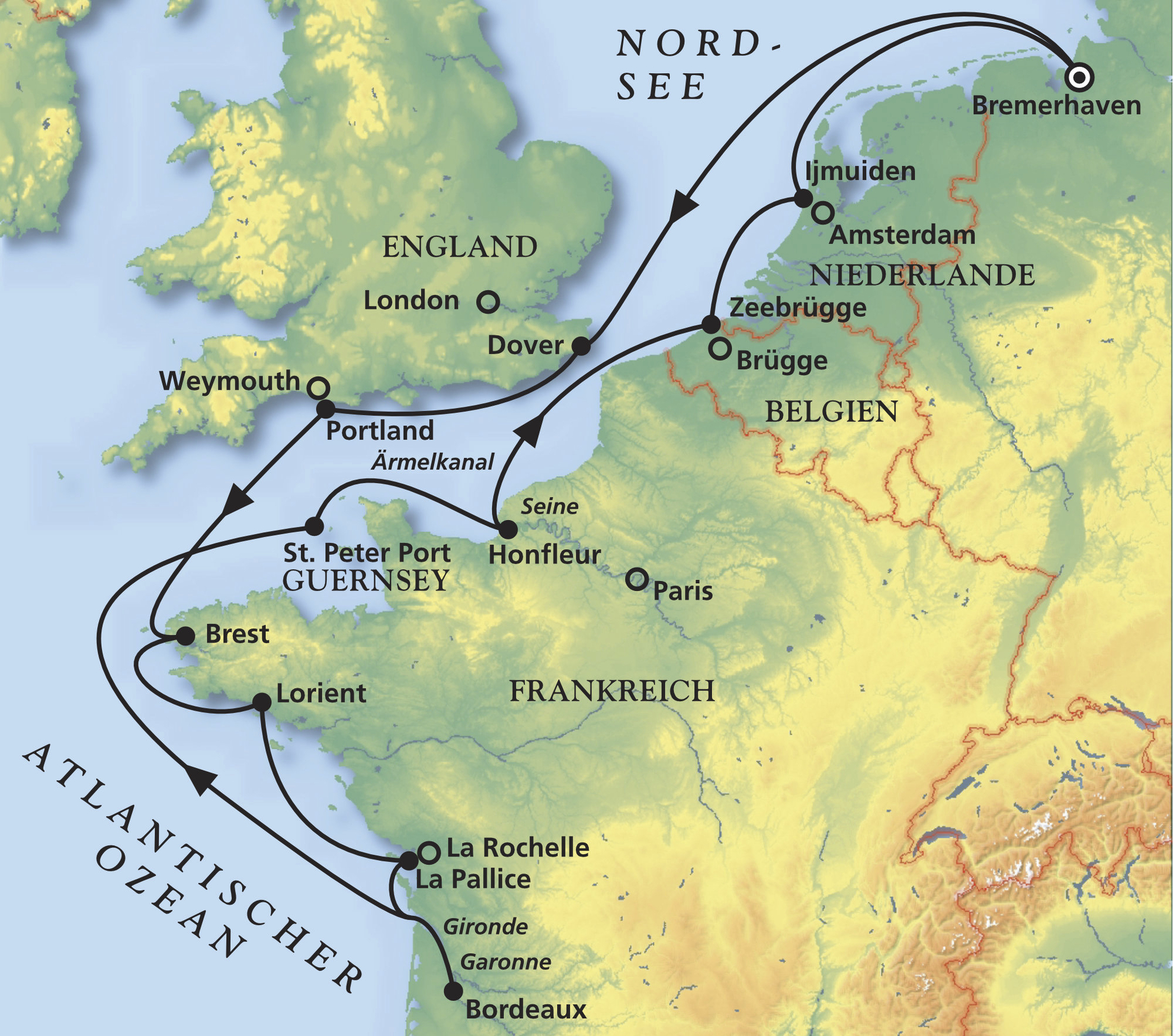 Bremerhaven - Dover - Brest - Bordeaux - Honfleur - Zeebrügge (Brügge) - Ijmuiden (Amsterdam) - Bremerhaven