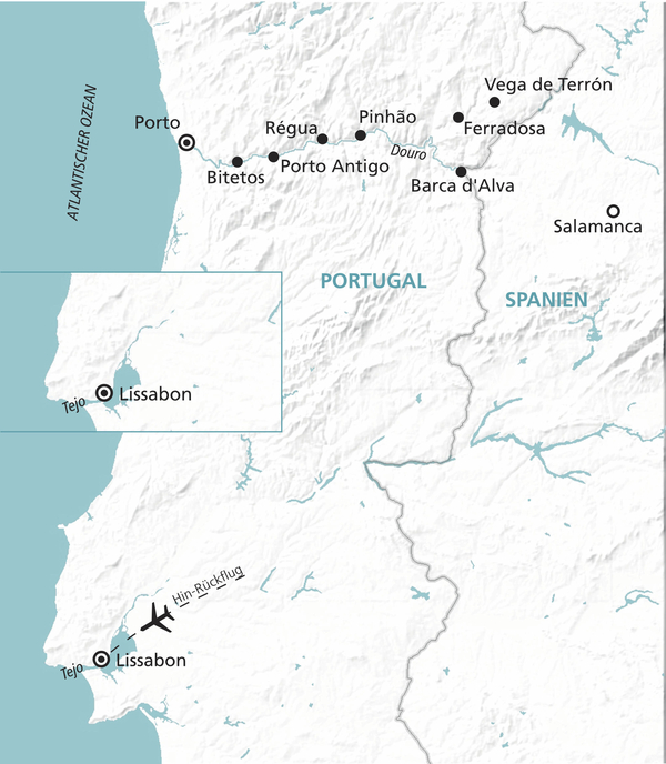 Lassen Sie sich auf einer Douro-Reise vom Charme dieses Flusses verführen. Ihre Reise startet in der Heimat des Portweins, Porto, wo ausreichend Zeit bleibt, die reizvolle Stadt kennenzulernen. In Régua, im Herzen der Weinanbauregion, erwartet Sie ein Ausflug nach Vila Real. Sehenswert sind die Kirche und die Kathedrale sowie zahlreiche Paläste und Herrenhäuser. Auf Ihrer Dourofahrt nach Barca d’Alva an der spanischen Grenze genießen Sie den landschaftlich schönsten Teil des Douro. Ein weiterer Höhepunkt Ihrer Reise ist ein Ausflug zum spanischen Salamanca, welches auf der UNESCO-Liste der Weltkulturgüter steht. Genießen Sie auf Ihrer Flussfahrt die abwechslungsreiche, liebliche Landschaft mit ihren Granitfelsen, Weinbergen, Pinien- und Olivenhainen sowie die üppige Vegetation der Küstenregion Portugals, bevor Ihre Flussreise wieder in Porto endet. Die Verlängerung mit einem 2-tägigen Stadtaufenthalt in Lissabon rundet diese Reise ab.