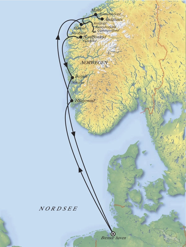 Bremerhaven - Haugesund - Hareid - Geirangerfjord - Molde - Åndalsnes - Nordfjordeid - Bergen - Bremerhaven