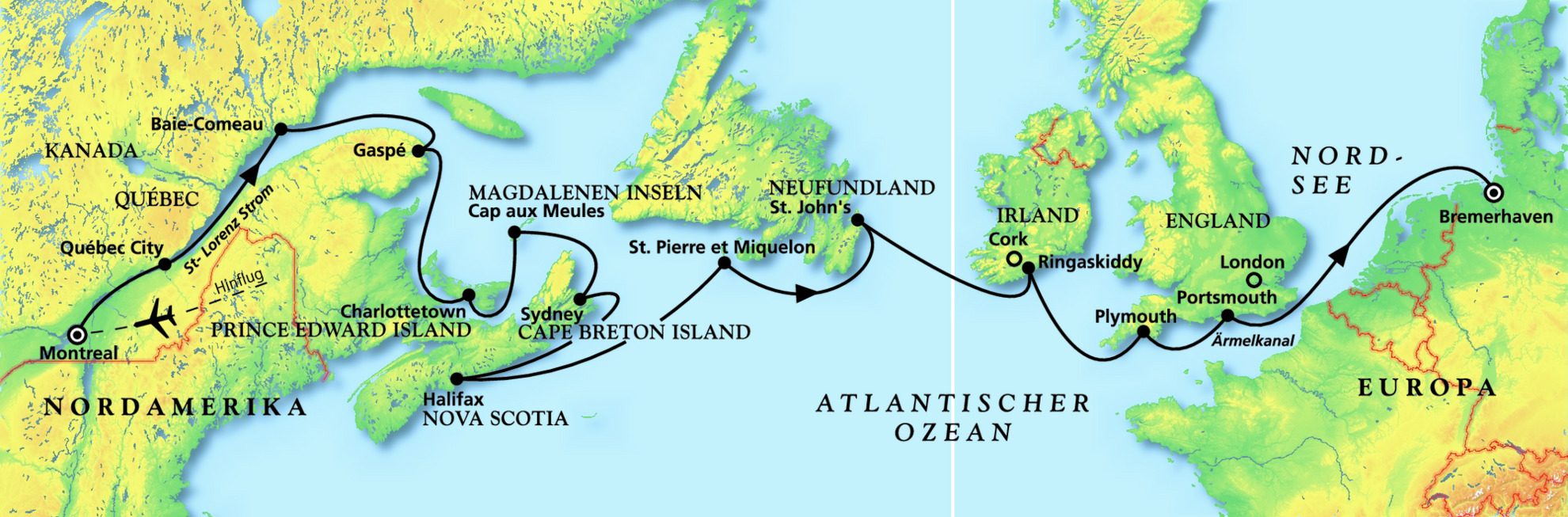 Montreal - Québec City - Baie-Comeau - Gaspé - Cap aux Meules - Sydney - Halifax - St. John's Ringaskiddy (Cork) - Portsmouth - Bremerhaven