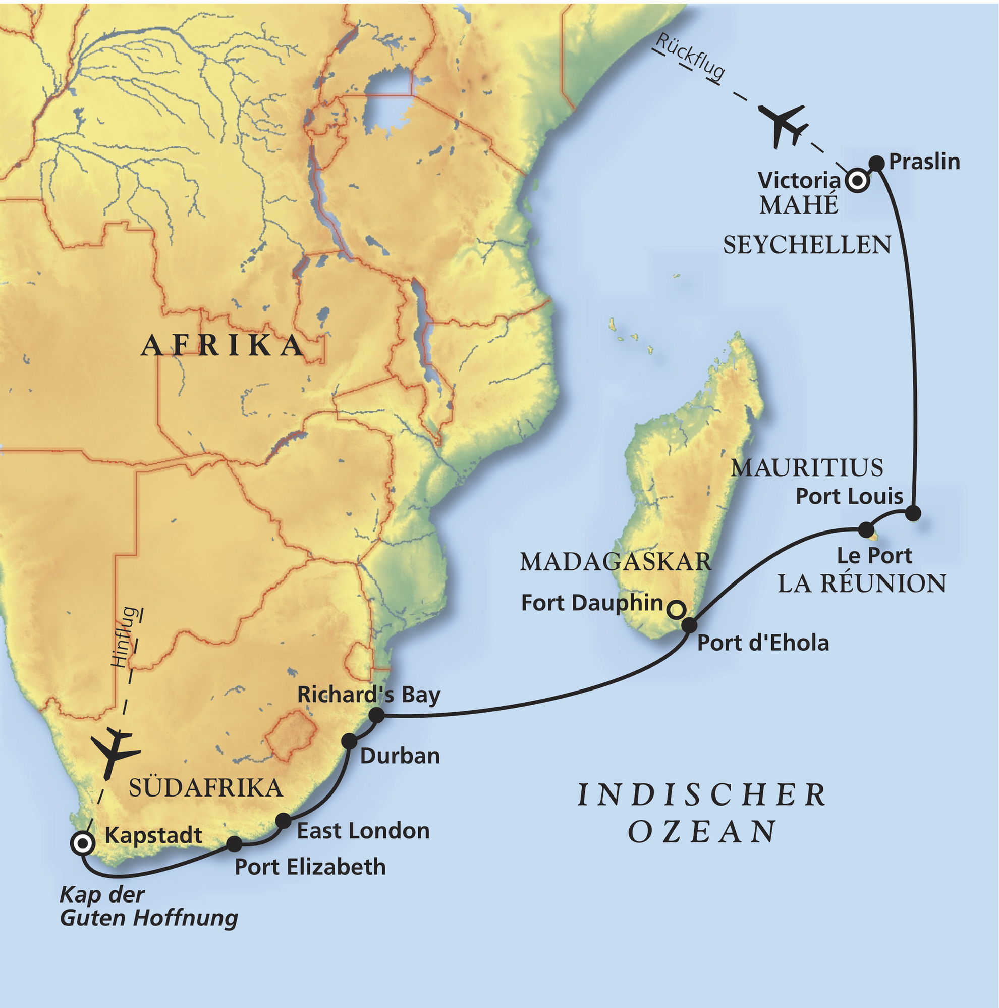 In Kapstadt werden Sie an Bord Ihrer MS Amera herzlich willkommen geheißen. Und wo besser als am Kap der guten Hoffnung ließe sich eine Kreuzfahrt beginnen, die gute Laune, sehenswerte Attraktionen und maritimes Flair verspricht. Die nächsten Tage verbringen Sie in Südafrika, ehe Sie mit Ihrer Amera über den Indischen Ozean zu Sehnsuchtsinseln wie Madagaskar, La Réunion und Mauritius kreuzen. Die Badeparadiese der Seychellen sind das letzte Etappenziel, bevor Ihre Kreuzfahrt für dieses Mal zu Ende geht.