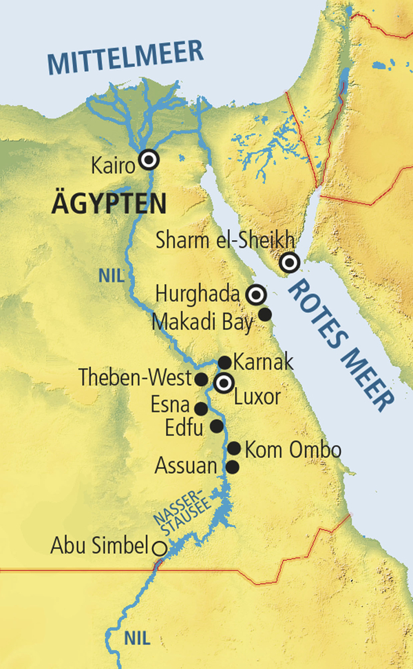 Unsere einwöchige Nilkreuzfahrt inklusive des klassischen Besuchsprogramms der bedeutendsten pharaonischen Sehenswürdigkeiten zwischen Luxor und Assuan. Dort liegen mit dem Tal der Könige und Karnak sowie rund um die südlichen Nilkatarakte vor dem gewaltigen Nasserstausee die Schwerpunkte der Reise. Während der Flussfahrten zwischen den beiden Orten erholen Sie sich auf dem Sonnendeck Ihres komfortabel ausgestatteten Nilschiffs, während Sie entlang malerischer Flussoasen mit der dahinterliegenden Wüste kreuzen. Unterwegs machen Sie Halt und bewundern weitere Höhepunkte wie Kom Ombos Doppeltempel und den gut erhaltene Horus Tempel von Edfu. Ein Abstecher zu den monumentalen Tempelanlagen Abu Simbels kann auf Wunsch von Assuan unternommen werden.