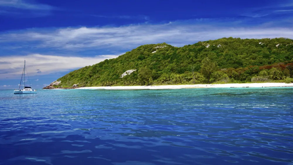Katamaran segelt vor einer tropischen Insel mit weißem Sandstrand