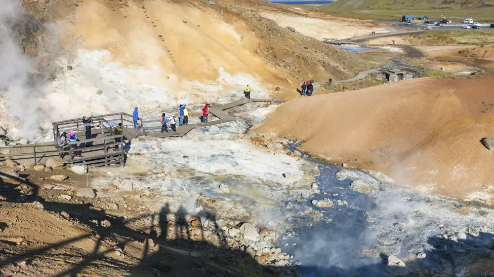 Besuchen Sie auf Ihrer Island Kreuzfahrt das Geothermalfeld Krysuvík, in dem es aus der Erde dampft und brodelt und die vulkanische Aktivität wahrlich sichtbar ist. Auf befestigten Stegen können Sie durch das Gebiet laufen und neben den rauchenden Dampfsäulen, die aus der Erde steigen, immer wieder schöne Panoramablicke über die Umgebung genießen.