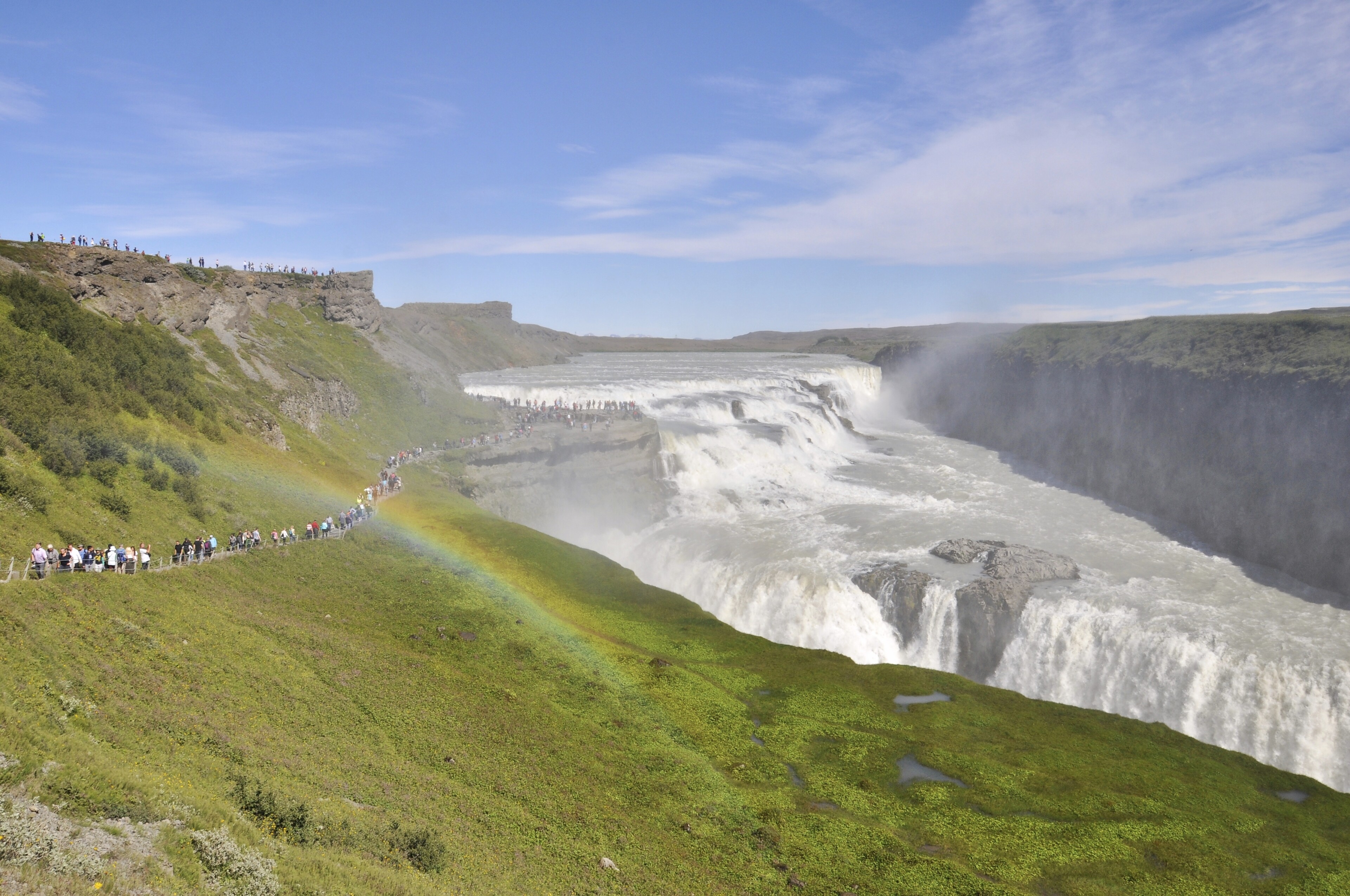 Eine der beliebtesten Attraktionen Islands Natur ist der Gullfoss-Wasserfall. Der in zwei Kaskaden in die 70 Meter tiefe Schlucht fallende Wasserfall ist ein beliebtes Ausflugsziel für Island-Besucher. Besonders die flache Ebene, die den Wasserfall umgibt, macht die Gegend so besonders.