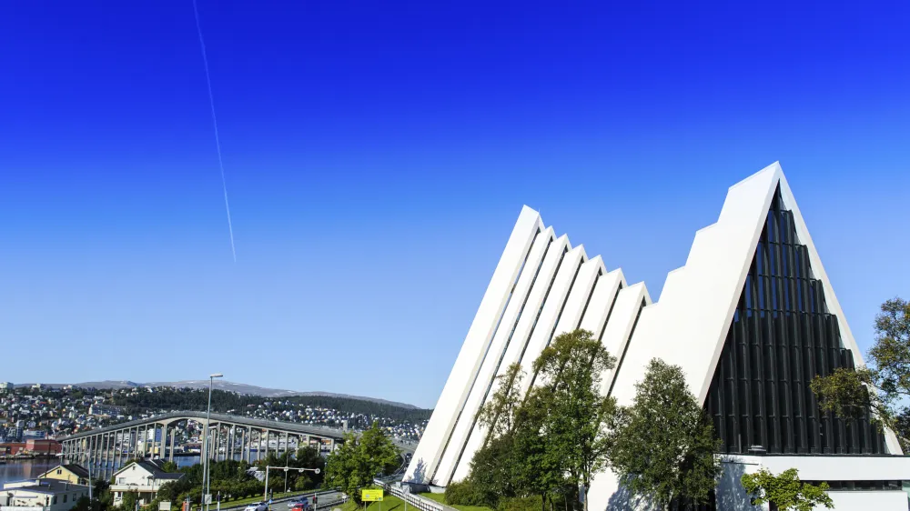 Die moderne Eismeerkathedrale in Tromsø erhebt sich beeindruckend.