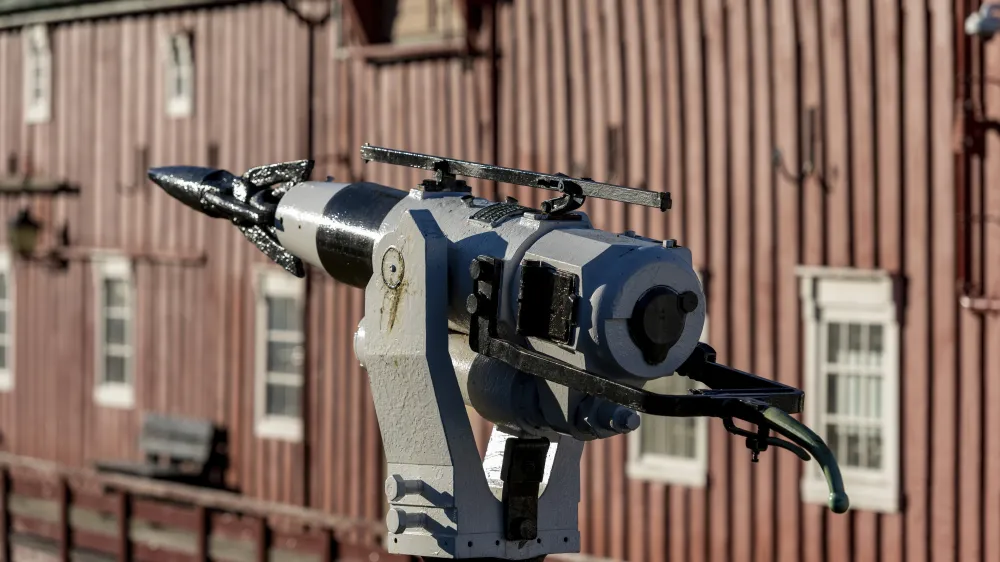 Historische Kamera auf einem Sockel vor einem roten Holzgebäude.