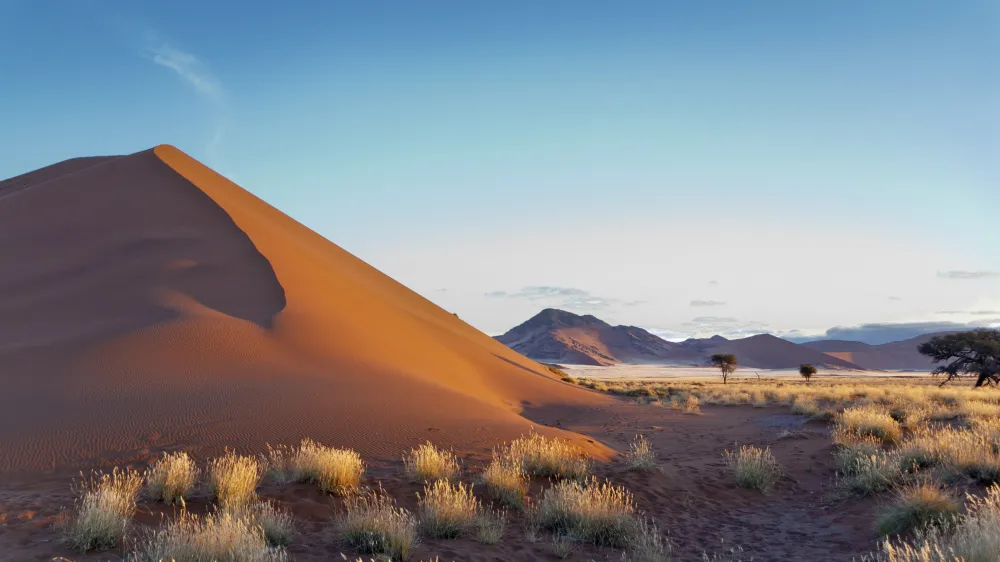 Die Lagune von Walfischbai zählt zu den bedeutendsten Feuchtgebieten im südlichen Afrika. Tausende Flamingos und Seevögel bieten ein eindrucksvolles Naturschauspiel. Unvergesslich sind Fahrten in die Namib-Wüste, wo sich ockerfarbene Dünen bis an den Ozean schieben. Das nahegelegene Swakopmund verzaubert mit Jugendstilbauten, Promenade und deutsch geprägter Geschichte.