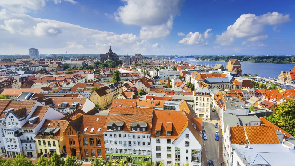 Rostock zeigt eine historische Stadtansicht mit vielen roten Dächern.
